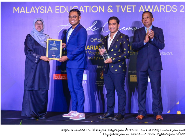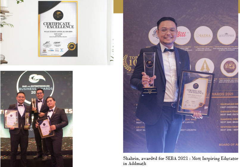 • SEBA Best SME 2021 – Best Service Provider in Secondary Education • SEBA 2021 – Most Inspiring Educator in Addmath • Malaysia Education & TVET Award 2022 – Best Innovation and Digitalisation in Academic Book Publication . media recognition (harian metro n so on)